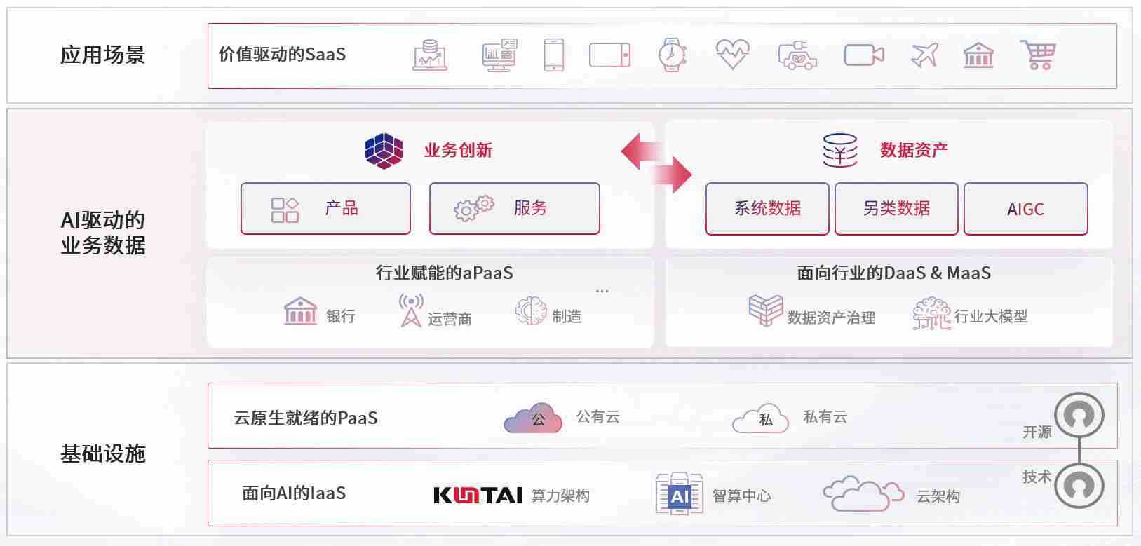 数字时代,,,,围绕企业数字化转型的关键要素,,,,NG28数码开创性的提出数云融合战略和技术体系框架,,着力在云原生、、、数字原生、、AI原生和信创产业上架构产品和服务能力,,,为处在不同数字化转型阶段的快消零售、、、、汽车、、、、金融、、医疗、、、政企、、、、教育、、运营商等行业客户提供泛在的敏捷IT能力和融合的数据驱动能力,,,构建跨界融合创新的数字业务场景和新业务模式,,助力企业级客户建立面向未来的核心能力和竞争优势,,,,全面推动社会的数字化、、、、智能化转型升级。。