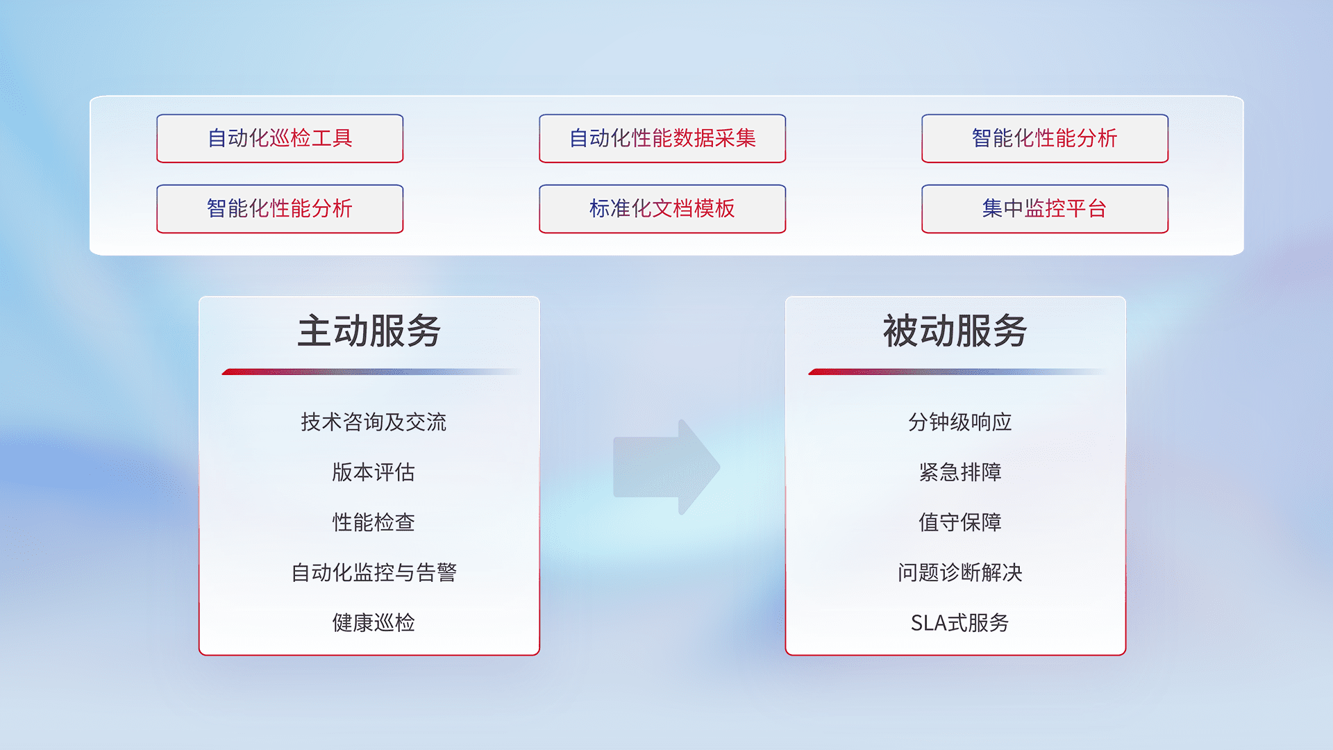 智能化工具和标准化文档,,保障服务质量,,,提供主动服务(包含技术咨询、、版本评估、、性能检查、、、、自动化监控与告警、、健康巡检)和被动服务包含(分钟级响应、、、、紧急排障、、、、值守保障、、、问题诊断解决、、、、SLA服务)。。。。